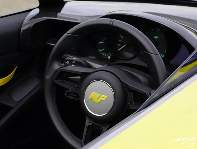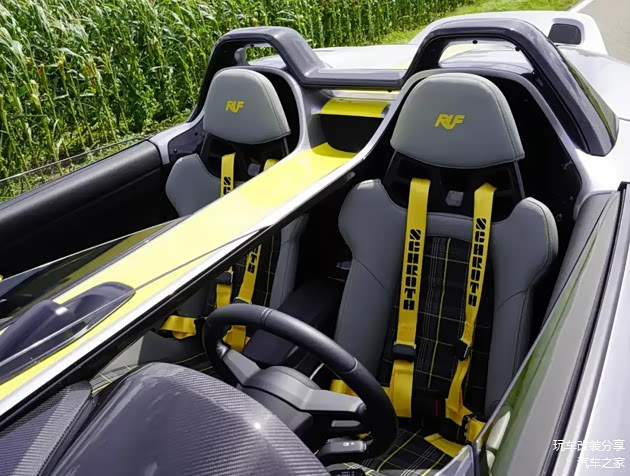 内饰部分也非常讲究,毕竟改造以后就直接裸露在外了。左右座位被分割开,黄色拉花可以直接从中间贯穿。仪表采用了碳纤维饰板覆盖,座椅采用黄黑色方格图案面料包裹,与外观相呼应,并且改用了四点式安全带。