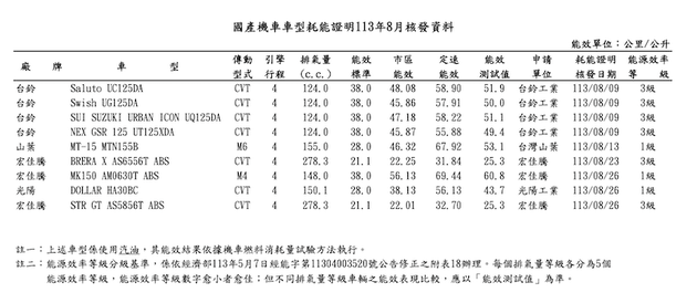 由台铃工业引进的 铃木 摩托车,旗下四款 125 踏板式两轮摩托车 Sui、Saluto、Swish 与 NEX GSR,出现在能源局 8 月的耗能证明名单里,从数据可看出明显比现行销售车款更为省油,Saluto 125 平均油耗更上看 51.9km/l。