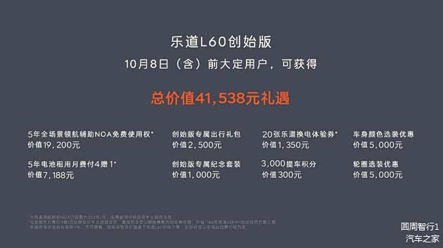 乐道L60将于9月28日起,全国开启交付。10月8日前下大定,即可成为乐道L60创始版用户,获得5年全场景领航辅助NOA免费使用权、5年电池租用月费付4赠1,创始版专属出行礼包等价值41,538元的多重礼遇。