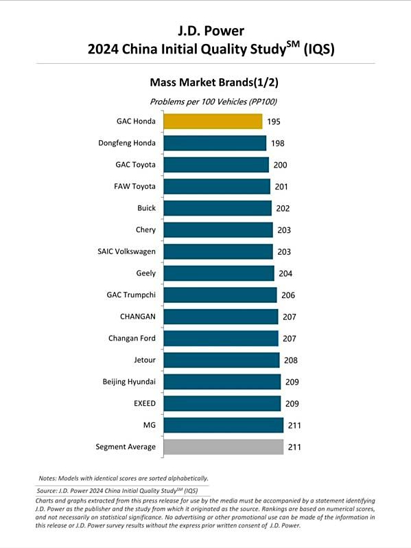 2024年,JD Power发布了备受业界关注的中国新车质量调查。在今年的榜单中,日系品牌本田和丰田强势领跑,前四名中有三席被它们占据。同时,中国品牌的表现也不容忽视,奇瑞成为表现最好的自主品牌,稳居前列。