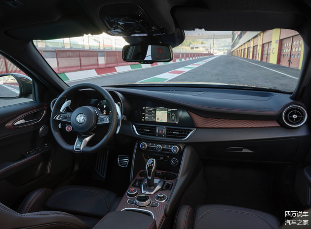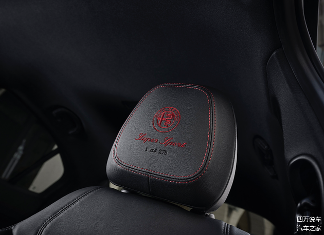 内饰方面,仍然是我们熟悉的样子,只不过在中控台、中央通道和门板等位置都采用了红色碳纤维3D饰面,搭配黑色缝线和碳纤维装饰,营造出强烈的运动氛围。前排头枕上的红色“Super Sport”徽标刺绣和限量编号彰显了Giulia朱丽叶四叶草黑标限量版的独特身份和尊贵地位。
