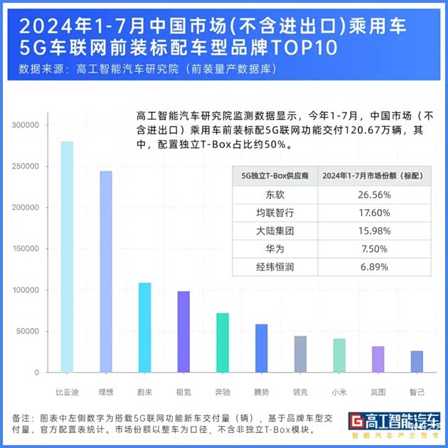 随着车路云融合趋势的加速以及5G技术在汽车行业的全面渗透与升级,5G车联网市场展现出蓬勃的发展潜力。其中,5G车载T-Box(即车联网通信盒)作为连接车辆与外部网络的核心组件,率先迎来了市场的显著增长。最新发布的《2024年1-7月中国乘用车市场5G车联网前装标配车型品牌TOP10》报告及同期5G独立T-Box供应商市场份额数据显示,东软集团的5G T-Box凭借高达26.56%的市场占有率,持续领跑行业。