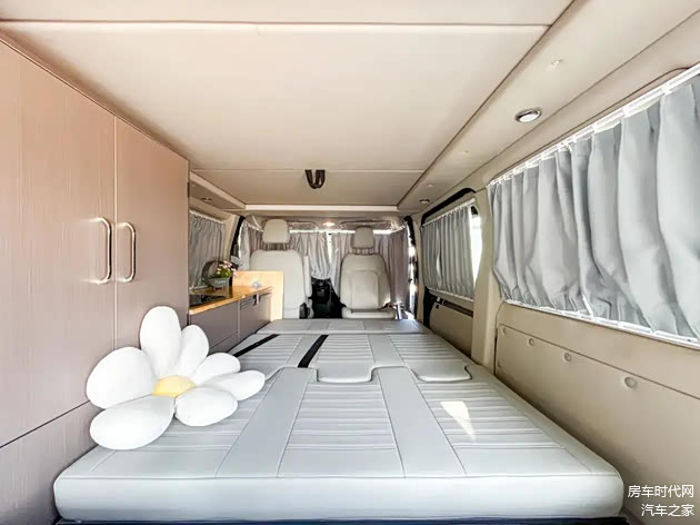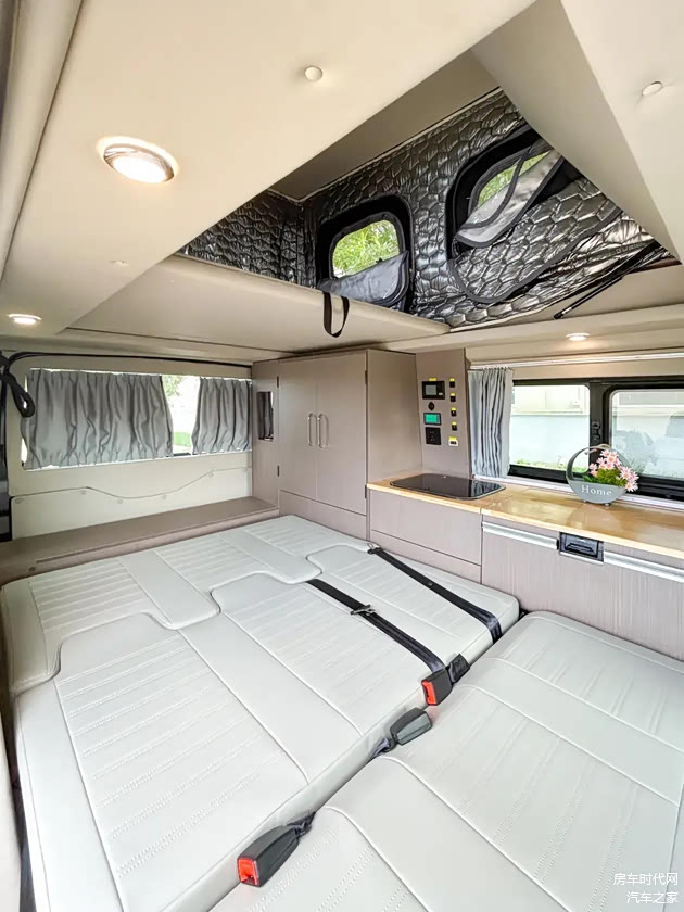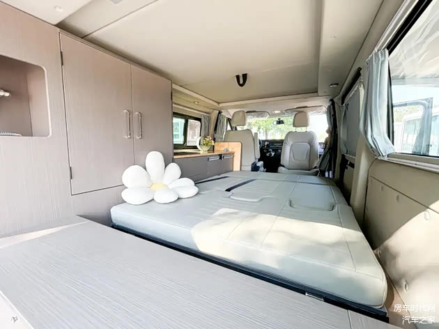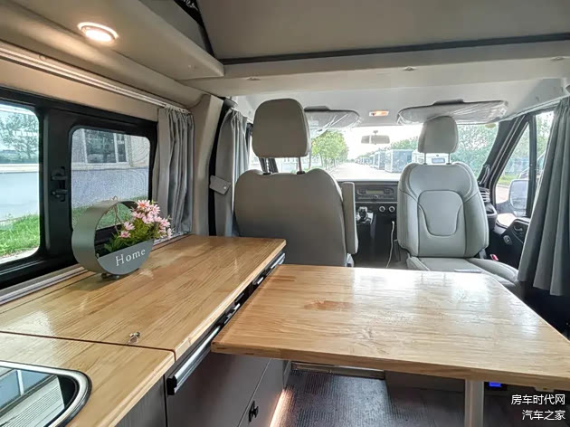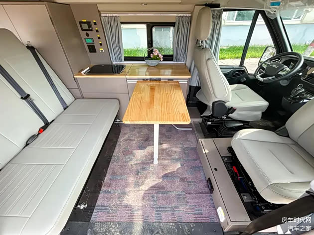 内饰布局清晰,前方为驾驶室,中部为会客区、厨房区,尾部为休息区。驾驶室座椅可以向后旋转,与后方会客区空间形成对向互动空间。会客区采用单排三座设计,整车可核载5人。中部还配备有可折叠桌,方便用户在此娱乐、用餐。桌板不用时收起即可,减少占用车内活动空间。