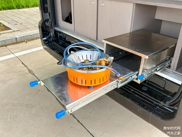 车侧设施丰富,配备有电动踏步、遮阳蓬(2.6×2.1m) 、外置充电口、外置加水口,满足车友户外露营所需。考虑到烹饪所需,本车还配备有便携式六星灶,便于车友可以户外烹饪美食。