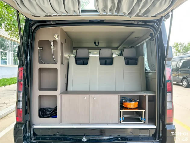 尾部车门采用上掀式设计,可以看到尾部区域配备有多个收纳柜和收纳格,拥有合理的收纳空间去分区储存旅途中所需的行李物品。