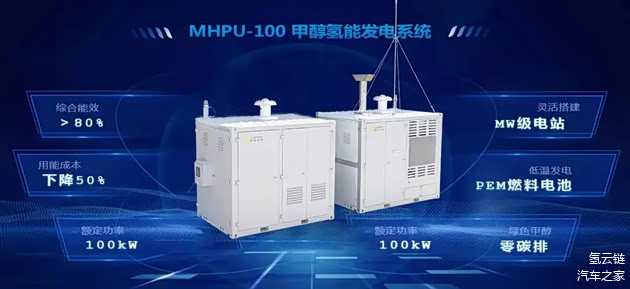 阳氢集团也发布了MHPU-100第二代甲醇氢能发电系统,该系统采用PEM燃料电池低温发电,单机额定功率100kw,采用标准模块化设计,可堆叠为多级别MW级可调功率电站,该系统综合能效超过80%,度电用能成本相对于柴发下降50%。