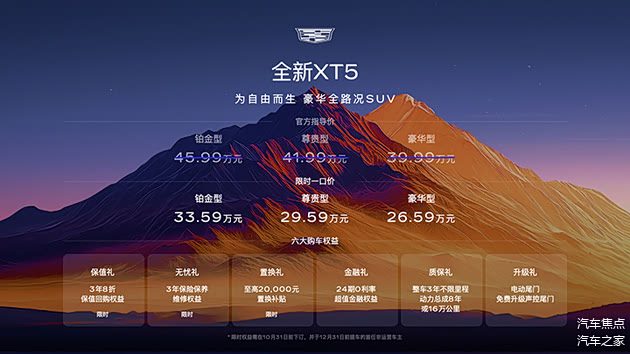 日前,汽车焦点从凯迪拉克官方处获悉,全新一代 XT5正式上市,新车共推出3款配置车型,官方指导价为39.99-45.99万元,同时还推出了限时一口价26.59-33.59万元,这个上市即优惠幅度放在国内市场中都称得上是前所未见。不得不说,在如今汽车市场内卷的大环境下,即使是凯迪拉克这样的传统豪华品牌,也不得不开启“价格战”。