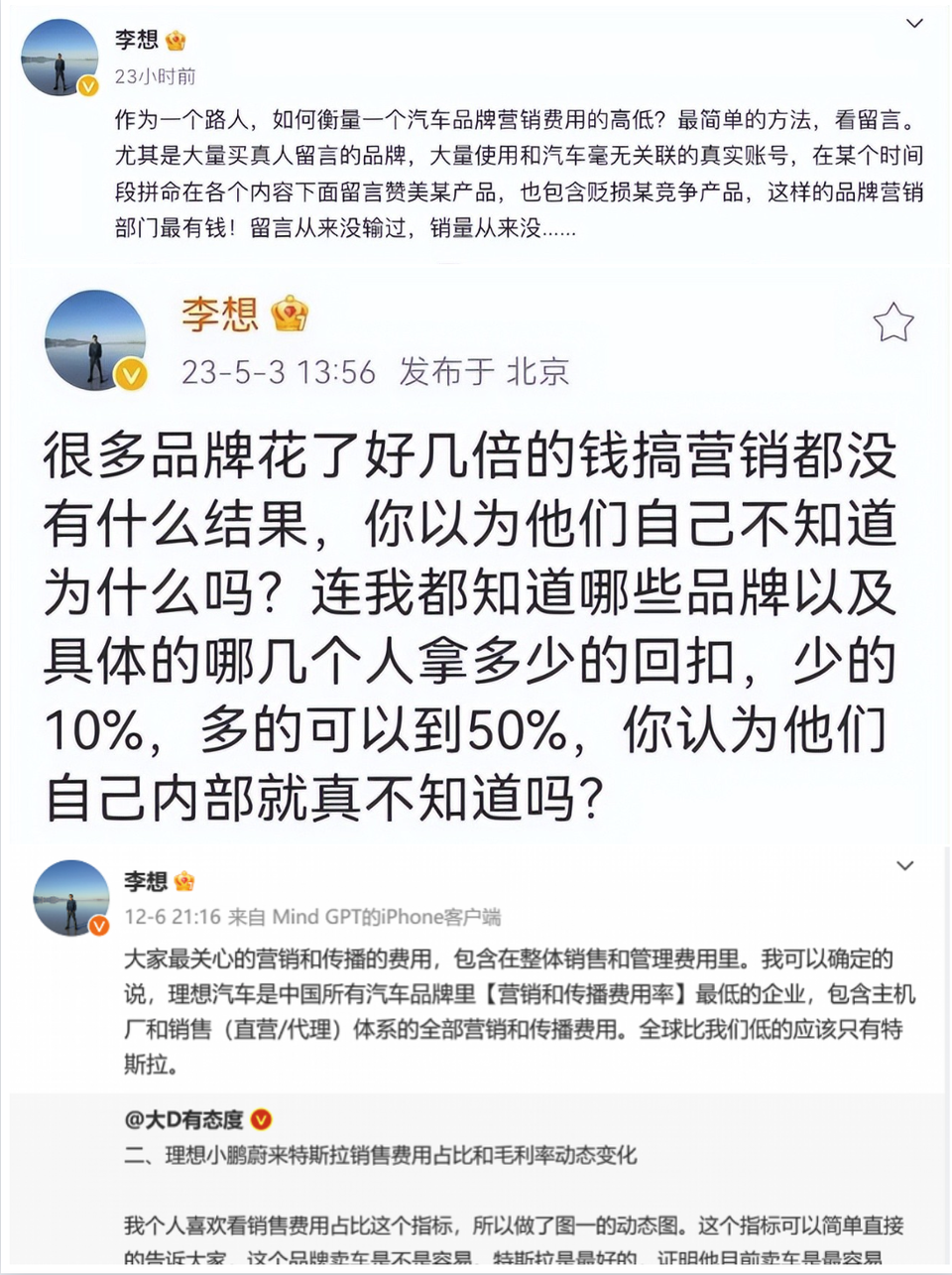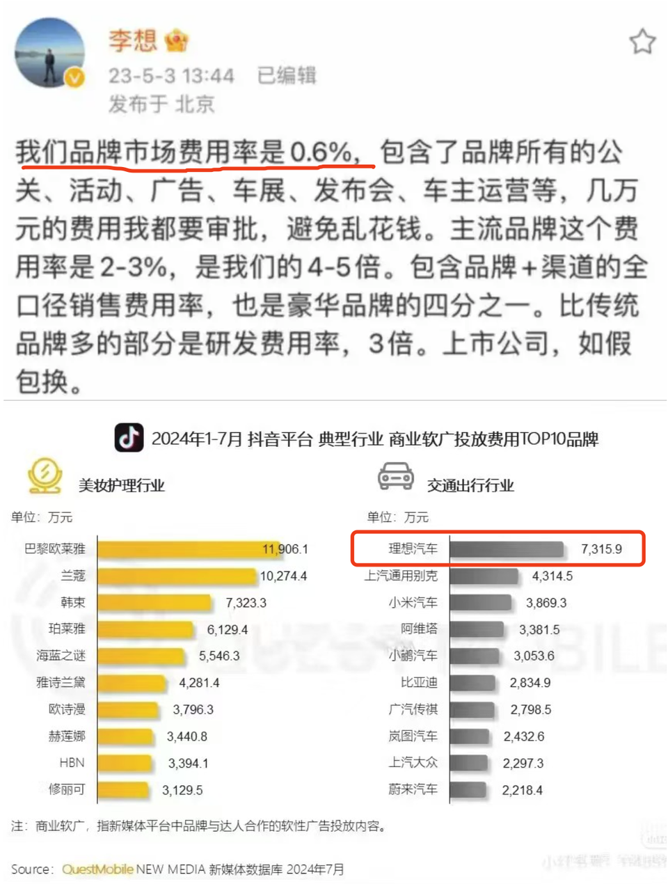 首先是2023年5月3日,李想“理想汽车品牌市场费用率是0.6%,包含了品牌所有的公关、活动、广告、车展、发布会、车主运营等,几万元的费用都要亲自审批,避免乱花钱。主流品牌市场费用率是2-3%,是我们的4-5倍。包含品牌+渠道的全口径销售费用率,也是豪华品牌的四分之一。”
