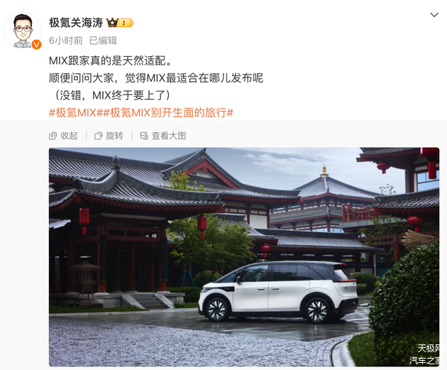 近日,极氪CMO关海涛发布一系列极氪MIX预热海报,并在评论区表示:“它终于来了”,随即引发众人联想,极氪MIX或在10月份正式上市。