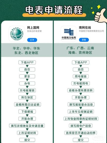 3. 下载电网 app 并申请:国家电网(华北、华东、华中、东北、西北)管辖省份,下载 “网上国网”;南方电网(广东、广西、贵州、海南、云南五省)管辖省份,下载 “南网在线”;内蒙古西电网管辖区域,下载 “蒙电 e 家”。打开 app 后,找到相应的充电桩报装入口,按要求注册并提交资料。南方电网申请时容量填写 21kva,接电需求选择 “充电桩用电”。车主可优先申请三相(380v)电表,若无法申请到 380v 则考虑申请 220v 电表,220v 电表容量填写 7kw 或者以上。