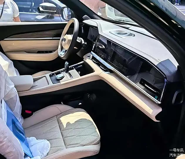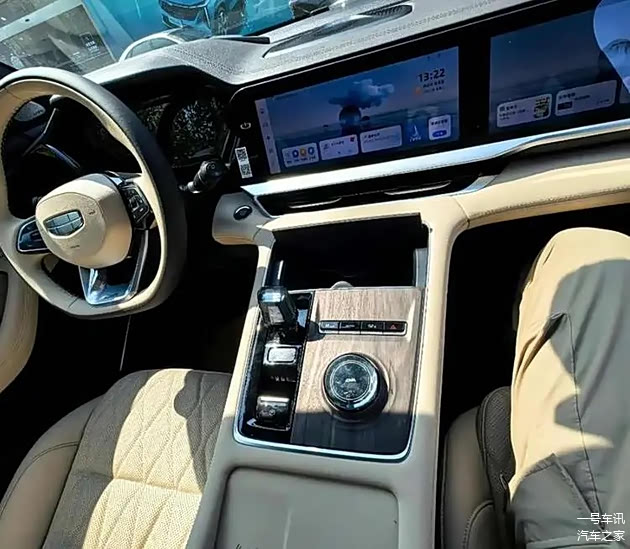 星越L车型内部装潢并未有大的变动,它依然拥有三块主要的大显示屏,这些屏幕是由嵌入式的中控和副驾双联屏以及一个带有遮蔽功能的液晶仪表屏所组合而成。三辐设计的平底方向盘采用了与内部装潢颜色相匹配的两块拼色,而车标LOGO则被修改为银色。但是,吉利在细节上确实做了一些优化,如在中央扶手部分的把手明显提高,与中控控台直接相连,取消了原有的实体按钮,前部设计成带有盖子的存储区,虽然左边还是换档区,但已经采用了更为精美的水晶直挡把手,而右侧保留了更多按键列。功能控制旋钮被扩大,使得整体看起来更为高档和精致。此外,新款汽车同样装备了受到8155芯片技术支持的银河OS操作系统。在硬件设备方面,新增了如头枕音响效果、座椅按摩效果以及二排座椅的电动调整等多种豪华舒适的选项。
