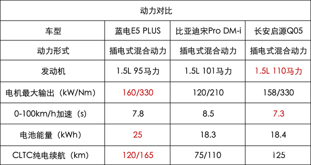三车均采用插电式混合动力,蓝电E5 PLUS和长安启源Q05的电机最大功率旗鼓相当,达到160kW/330Nm左右,接近高功率2.0T发动机的输出。而宋Pro DM-i的电机性能稍弱一些,但三车的零百加速均达到8秒上下,加上电驱为主的输出特性,动力体验自是不差。