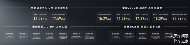 2025款瑞虎9和瑞虎9 C-DM的起售价分别为15.29万元起、16.59万元起,当前下定即可尊享多重购车礼遇,以更低门槛轻松购车。