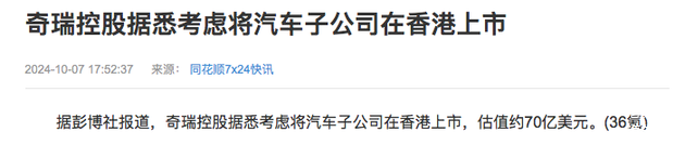 10月7日,据多家媒体报道,奇瑞控股有限公司正考虑使其汽车部门在香港上市,估值可能达约71亿美元(约502.21亿元)。报道称,奇瑞正在寻求银行的支持,以帮助进行公司的首次公开募股(IPO),目前讨论仍在继续,IPO的具体规模等细节可能会有所变动。