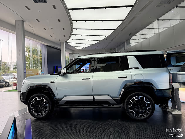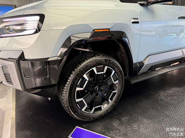 在外观部分,我们还能看到几个特点。第一是位于车顶前方的激光雷达,豹8采用了华为乾崑智能驾驶方案。第二是车尾采用了半裸露式的外挂式备胎。第三是这辆展车的轮胎规格为275/50 R21,这是一条米其林的新能源专用轮胎,用在豹8的身上看着不太协调,豹8应该用的是越野AT胎。