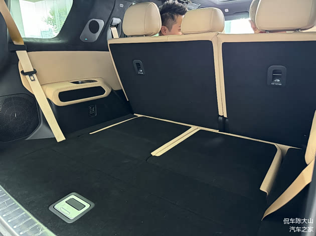 要进入第三排,只能通过放倒第二排右侧座椅,只需要单击第二排右侧座椅上的按钮,该座椅就会向前滑动折叠。豹8的第三排座椅同样为电动调节,它只有一个调节按钮,坐垫的角度和靠背的角度会联动调节。此外,第三排座椅还提供了独立的空调出风口、USB-C的接口以及杯座。