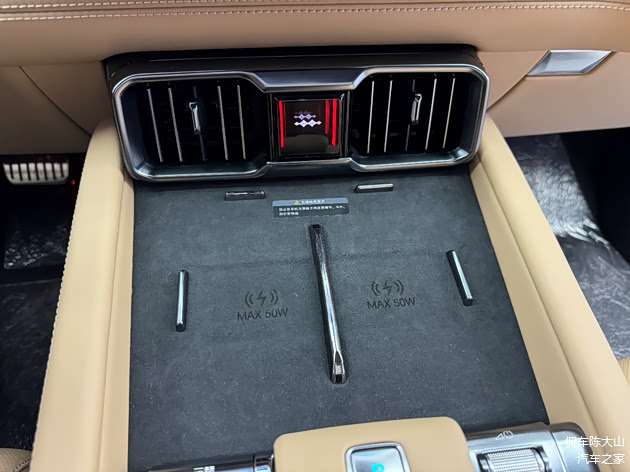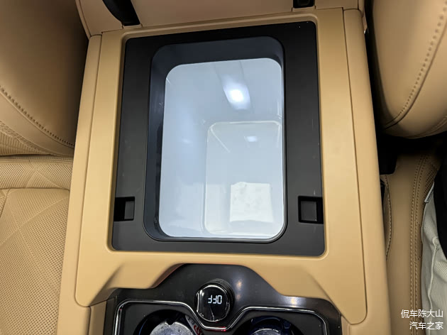 前排的配置很多,比如中控台延伸下来就是它的双50W无线充电面板,中央扶手箱的位置是车载冰箱,容量是7L,制冷的时候,温度范围是-6℃-6℃,制热的时候,温度范围是35℃-50℃。