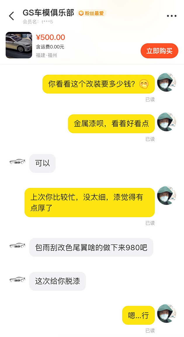 咸鱼上与之前有过合作的卖家沟通,确定了最终价格——980元,项目为改色、修复,并定制了尾翼和雨刷。
