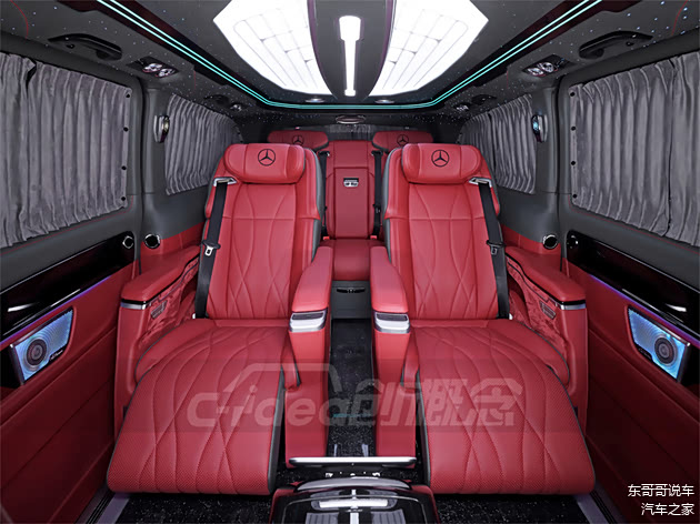乘坐舱内饰更是本次改装的一大亮点,第二排座椅加装了两张航空座椅,带加热,按摩,通风,一键式电动调节记忆等功能。180°旋转后可以与第三排电动沙发床进行无缝拼接,满足两个成年人一个小孩的正常休息,带来卧室级舒适享受。