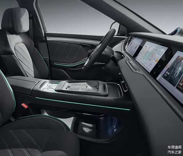 内饰部分,还是三联屏设计,中控大屏,全液晶仪表和副驾驶屏幕尺寸都是12.3英寸。中央通道位置较高,带手机无线充电面板和可升降杯架。下方带较大的储物空间。座椅加入了绿色缝线,和绿色氛围灯搭配还比较漂亮。座椅头枕也带有软枕。