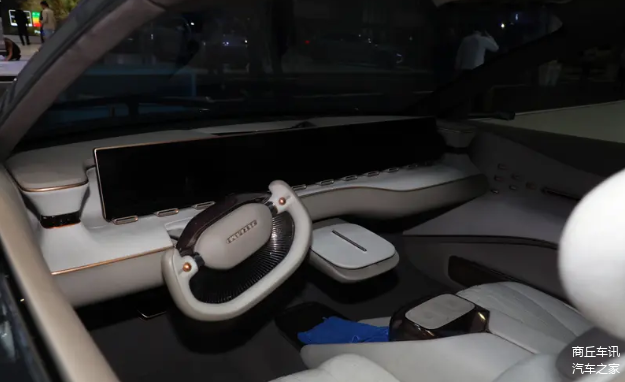 内饰方面,创维 SKYWORTH Y 概念车充满科幻感。伞状藻井设计的半辐式多功能方向盘搭配 45 英寸的超长连屏,两侧还有香氛、氛围灯、音响三位一体的“琉璃灯盏”设计,共同组成了科幻般的中控台。