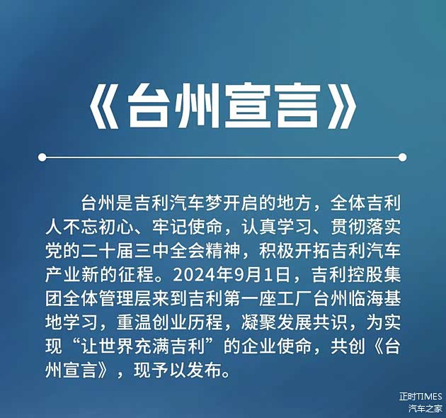 9月20日,吉利发布了包含“战略聚焦”、“战略整合”、“战略协同”、“战略稳健”以及“战略人才”五个举措在内的《台州宣言》。这也是吉利继《宁波宣言》后,时隔17年发布的最新发展战略。