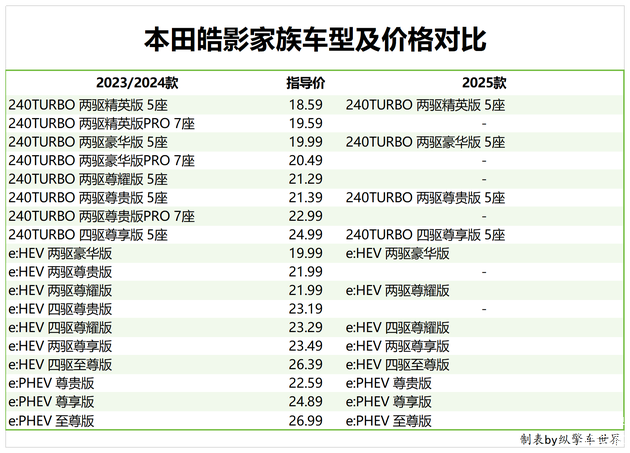 日前,广汽本田官方宣布,2025款本田 皓影正式上市,新车共提供11款配置车型,包括4款燃油版、4款e:HEV油电混动版以及3款e:PHEV插电混动版车型。与老款相比,新车在价格上保持不变,但精简了车型的数量,燃油版不再提供两驱精英版PRO 7座版、两驱尊耀版 5座版以及两驱尊贵版PRO 7座版,油电混动版不再提供e:HEV 两驱尊贵版和e:HEV 四驱尊贵版。