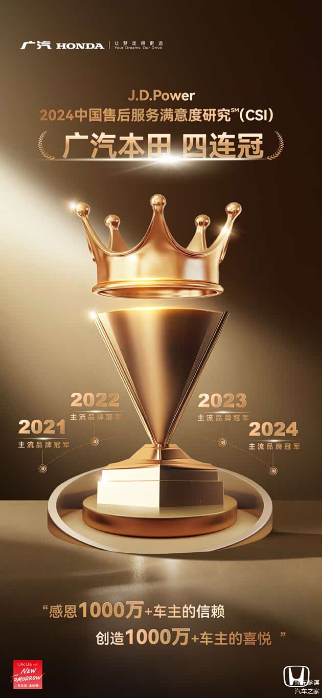 2024年9月19日,全球领先的消费者洞察与市场研究机构——J.D. Power发布《2024中国售后服务满意度研究SM(CSI)》报告。广汽本田以792分荣膺CSI主流车品牌冠军,领先众多参评品牌,并成为中国汽车行业首家连续四年(2021—2024年)获得客户满意评价最高奖项的主流汽车品牌。