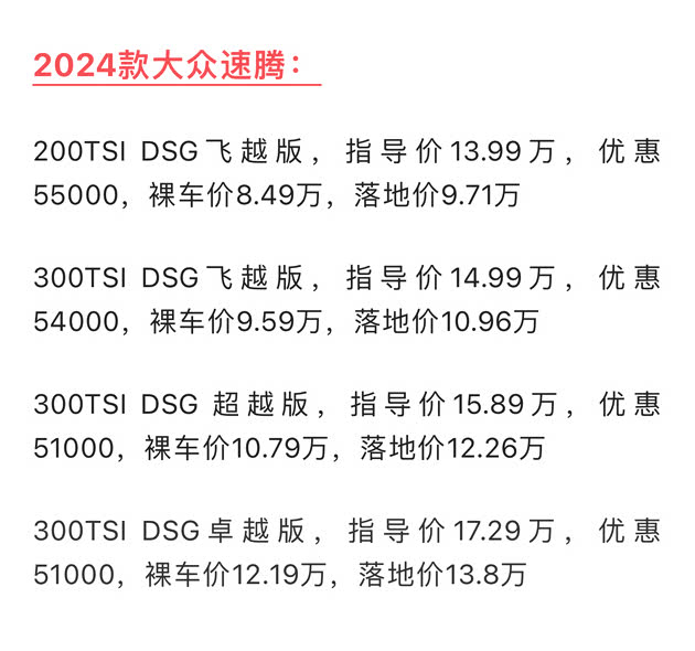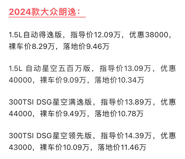 有人说1.5自吸的动力接受不了,那么1.5T版本的朗逸值得入手吗?以目前的价格来看,完全不用考虑。你要是想买1.5T的朗逸,那么出门左转,直接上一汽大众看速腾就可以了。现在1.5T朗逸优惠后的起售价在9.5万左右。那你知道1.5T的速腾现在多少钱吗?优惠后起售价约9.6万,速腾整体定位是要比朗逸高的,底盘四轮独悬,整车的用料做工也更优秀,这价格不选速腾还看朗逸,想啥呢?