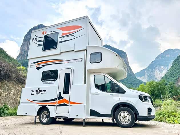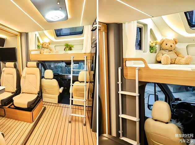 继舒馨阁S688后,飞翔房车又带来一款基于福特T8底盘打造的升层系列房车,驻车后展开升顶结构后可以形成上下双层的旅居空间,再加上一层的侧拓结构,能够为用户带来非常宽裕的车内活动空间。上方可以当作一个独立的卧室使用,为了方便乘员,上层也单独设计了卫浴功能区,车内生活设施丰富,内饰温馨细节满满,标配版指导价格为78.8万元。