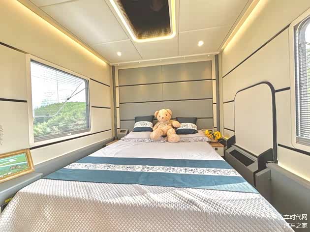 二层为用户配置了一张1.5×2m的双人床铺,床头做了软包处理,床侧还设计有两个床头柜,质感十足,驻车后可将二层的两个大尺寸外推窗打开,带来优质的观景体验。