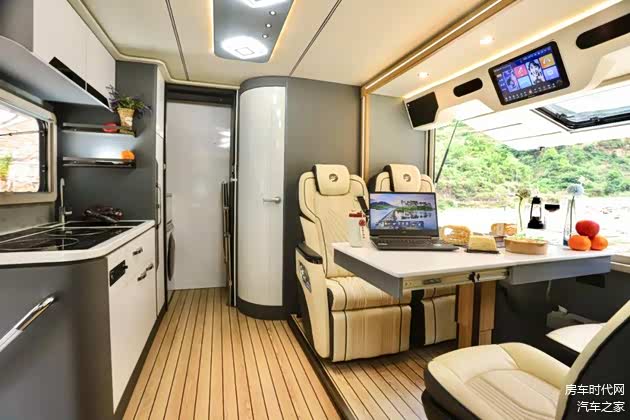 车辆内饰以灰色和原木板材为主,铺设有游艇级防水耐磨木制地板革,内部灯光系统柔和,营造出温馨的旅居空间。驻车后可将侧拓展展开,会客空间会随拓展结构向外延伸,车厢内部的活动空间得以提升。