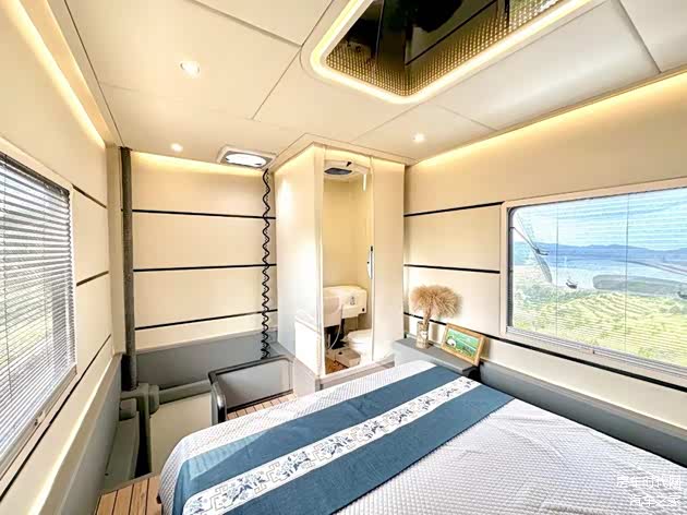 固定床铺尾部为可伸缩卫浴间,外部采用了复合聚氨酯材质,可随车辆的升顶结构一同升降,内部配置了洗手台、电动粉碎马桶以及智能淋浴花洒,卫浴设施齐全,两处独立卫浴间大大提升了旅居效率和舒适度。