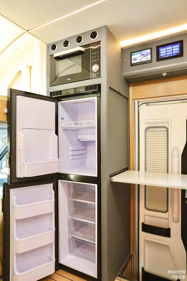 车内还配置了海尔微波炉以及168L弗罗斯特房车专用冰箱,区域内还设计了折叠桌板,能够临时增加操作台面空间,便于用户备菜、制餐。