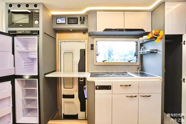 车厢另一侧为厨房区,配置有电磁炉以及隐藏式升降油烟机,最右侧为嵌入式洗菜池,侧面墙板设计有置物架,可以收纳一些厨房用品,厨台下方为内外贯通的储物空间,便于室内外使用。
