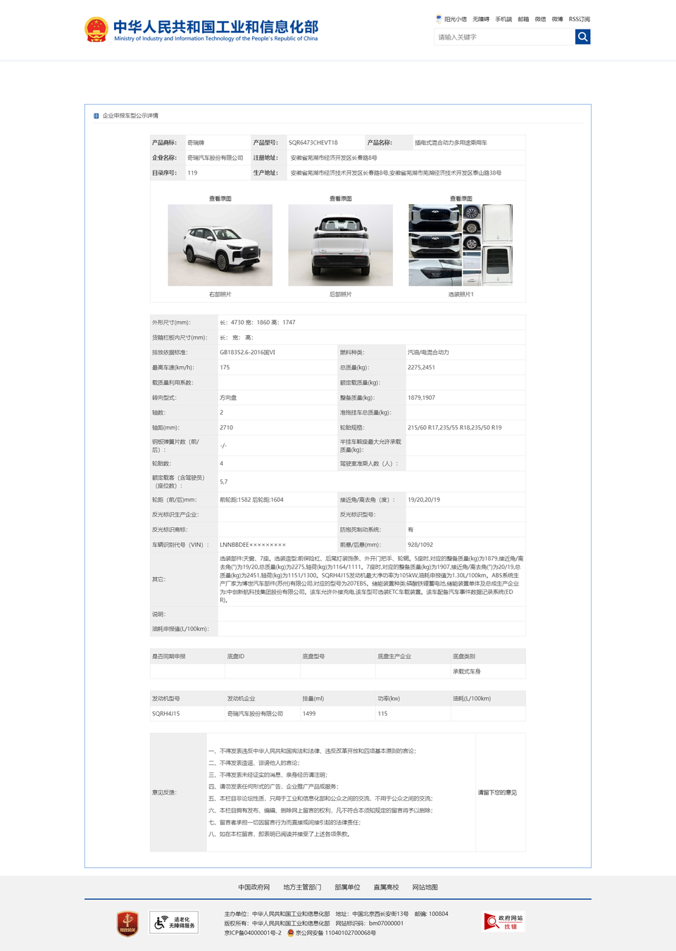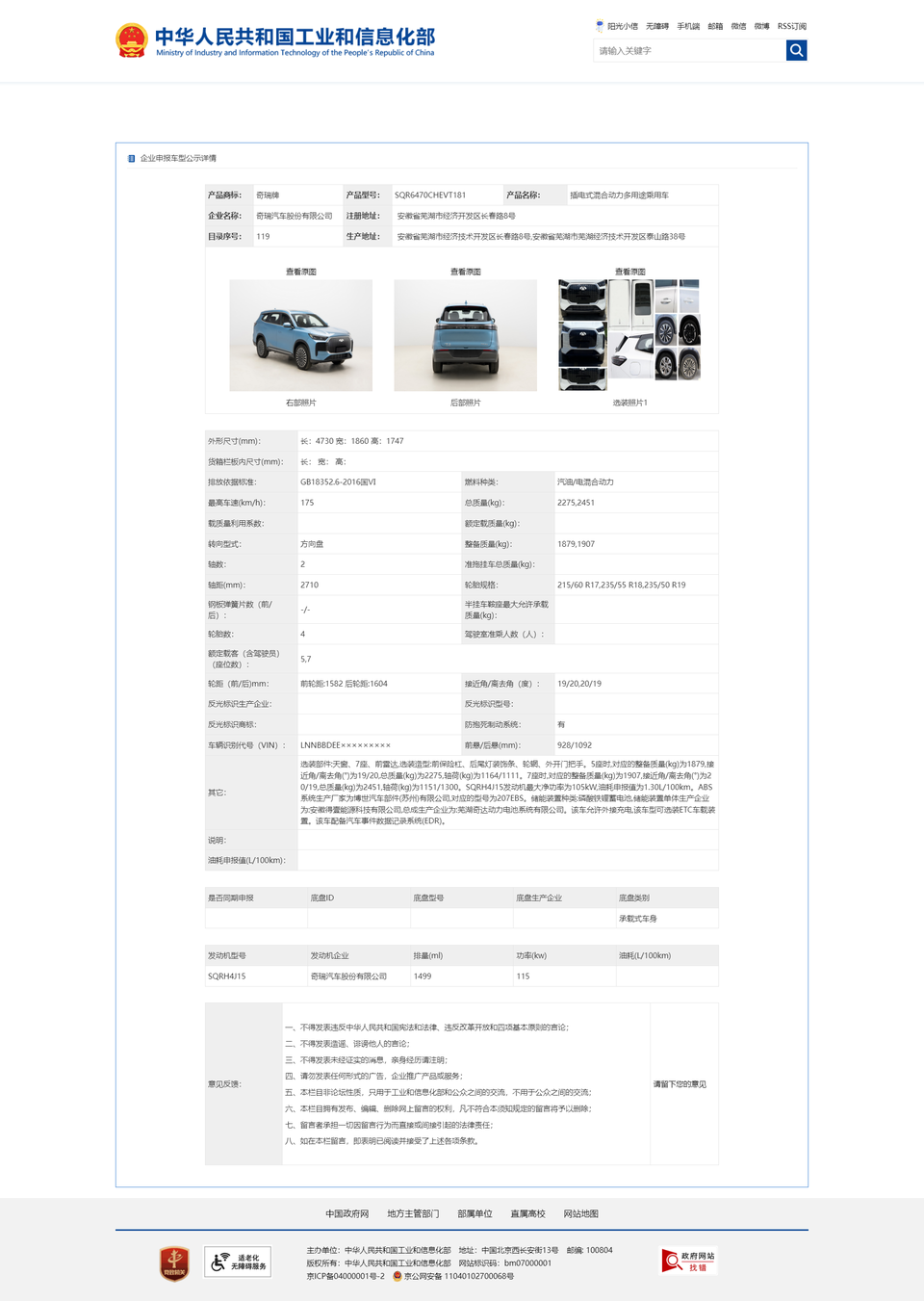 奇瑞风云T8 C-DM:配备中创新航/得壹能源电芯 外形尺寸(mm):长:4730 宽:1860 高:1747 轴距(mm):2710 发动机功率(kw):115 电池1:储能装置种类:磷酸铁锂蓄电池,储能装置单体及总成生产企业为:中创新航科技集团股份有限公司。 电池2:储能装置种类:磷酸铁锂蓄电池,储能装置单体生产企业为:安徽得壹能源科技有限公司,总成生产企业为:芜湖奇达动力电池系统有限公司。