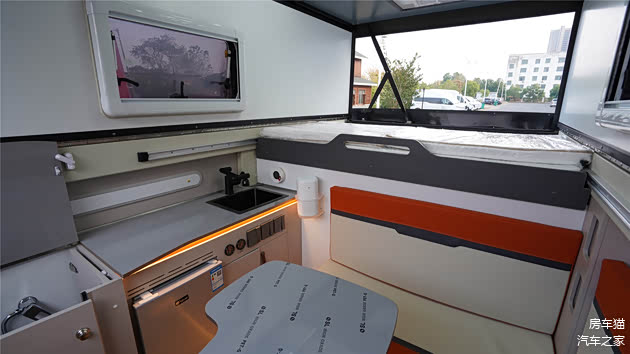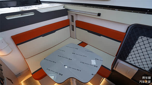睡卧区位于前方,采用抽拉式大床设计,拓展后尺寸可达1.8mx1.9m。升顶后整体高度表现较好,不会有压抑感。生活区前部设有L型卡座,搭配快拆桌可供驻车时休闲娱乐、餐饮、商务办公使用。
