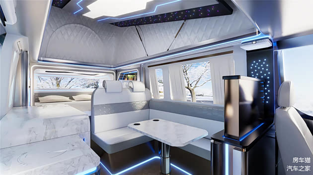 吉利远程超级VAN房车巧妙地融入了硬升顶设计,当升顶展开后,车内空间瞬间变得宽敞明亮。顶部区域摒弃了传统的主灯源设计,转而采用柔和的灯带作为主要照明元素,这些灯带巧妙地分布在车顶四周,不仅提供了充足的照明,还营造出一种温馨而舒适的居家氛围,让旅途中的每一刻都充满惬意与享受。