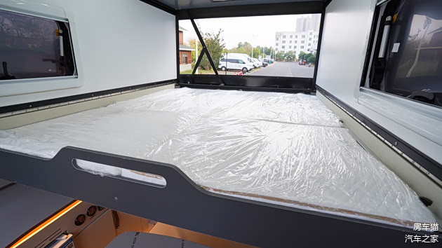 和效果图还有不一样的地方就是后横床将不设计拓展舱,不过尺寸依然可以达到1米78*1米35。在加上顶部的升顶床,尺寸为2米*1米3,两张床铺的设计,这款房车睡下一家四口是没什么问题的。