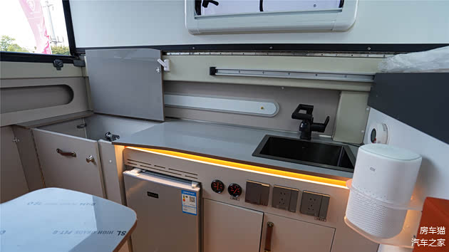 车厢内侧设有紧凑而功能完备的厨房区域,尽管空间紧凑,却配备了齐全的设施。橱柜内嵌有便携式电陶炉、冷热水兼备的洗菜池以及50升的冰箱,足以应对日常烹饪与食物储存需求。此外,厨房区域中央还巧妙地安装了220V电源插座以及12V+USB充电接口组合。