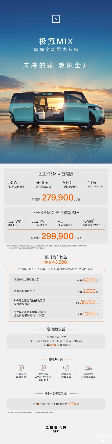 各位车友们,注意了!2024年10月23日,在杭州这座充满活力的城市里,极氪智能科技为我们揭开了家庭全场景大五座新成员—— 极氪MIX的神秘面纱。这款新车带着满满的诚意与惊喜正式上市,智驾版和长续航智驾版分别定价27.99万元和29.99万元,即刻起全国交付启动。如果你正寻找一款空间利用率超高的家庭座驾,极氪MIX绝对值得一看,它用实际行动诠释了“小空间大作为”的理念,咱们不妨一起深入了解下。