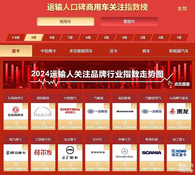 东风公司9月销售重卡7634辆,市场占有率为13.23%,环比下降22.47%,同比下降43.25%,1-9月累计销量为109117辆。在9月运输人品牌指数榜中,东风商用车的关注指数为4596。在运输人口碑最热产品排行榜中,除去天龙KL之外,东风商用车旗下的天龙旗舰GX等多款车型榜上有名。此外,东风柳汽乘龙H5、乘龙H7也广受运输人好评。