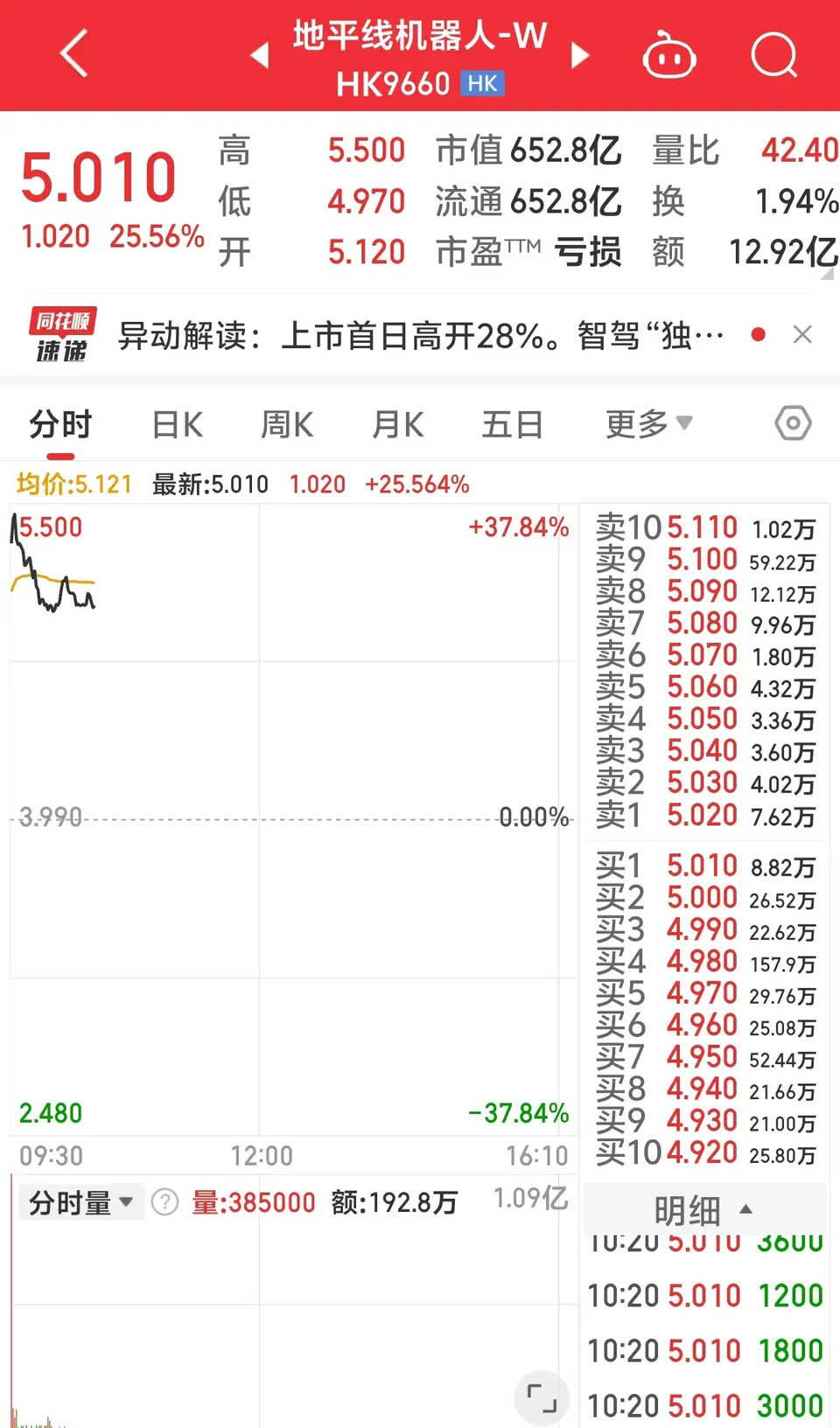 国产高阶智驾龙头地平线今日在港交所上市,开盘价报5.12港元,上市即上涨,一度涨至最高价5.50港元,涨幅7.4%,不过最低价也一度破发,降至4.97港元,跌幅2.9%。目前,地平线机器人-W(HK9660)最新总市值超过650亿港元,成为港股今年最大的科技IPO。作为参考,更早上市智能汽车AI芯片第一股黑芝麻智能股价为25.4港元,总市值不到150港元。