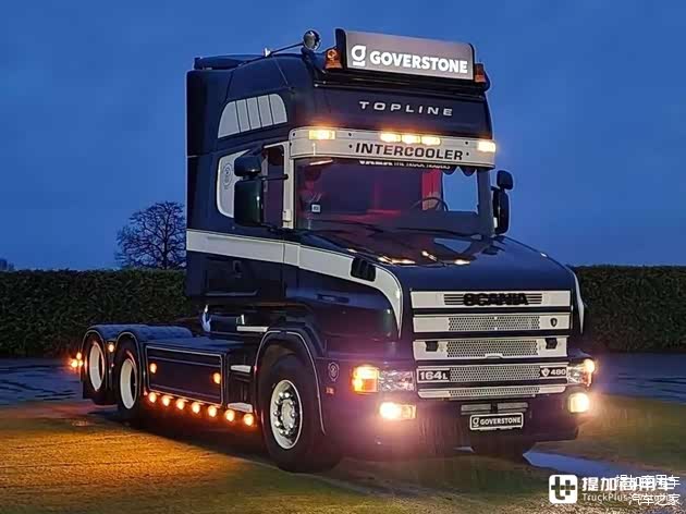 由于车身结构的特殊性,斯堪尼亚T系一直是改装市场的常客。不过,这台T 164长头卡车的改装风格还是相当的克制,没有增添太多花里胡哨的配置。前风挡上方增添遮阳板,带有提示灯及INTERCOOLER“中冷器”字样标志。驾驶室顶端增添灯架、灯箱、旋转告警灯等零部件,并附加镀铬气喇叭,整体造型内敛,但亦突出了欧式卡车的改装风格。