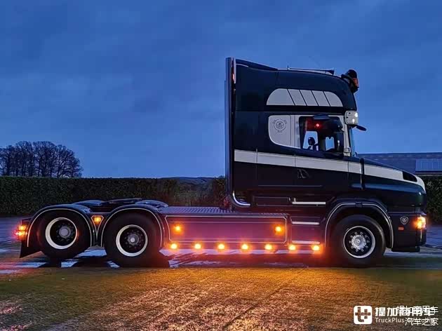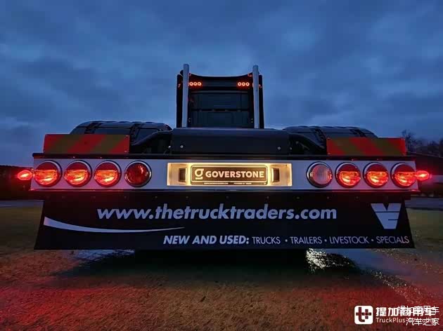 前脸、侧面都改了,那车尾不改怎么行?在车架尾端,这台斯堪尼亚T 164搭载了新的复古式保险杠,由多枚圆灯来组合实现尾灯功能。保险杠中部是车辆的牌照区,由暖色灯光进行照亮,视觉效果还是相当到位的。