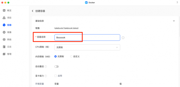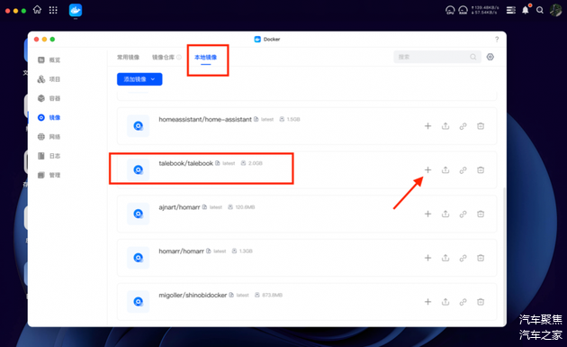 我们下载好Talebook容器后,在本地镜像中找到它,点击“+”号来创建容器。(温馨提示:如果镜像拉取不动,可以试试配置这个加速器 )
