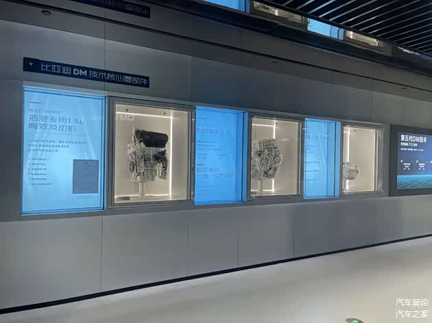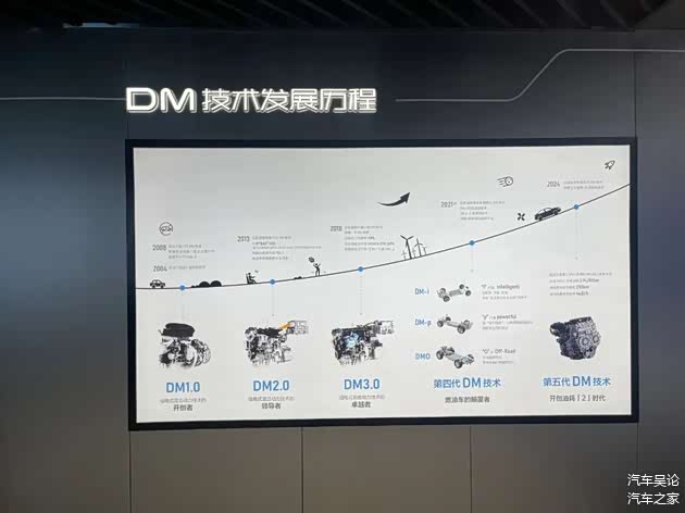 如果你对电动车的技术感兴趣,我相信三楼将满足你。三楼的中心位置,有八个大字“技术为王 创新为本”被众多技术专利证书所围绕,这正是比亚迪的发展理念。这里我只选取拍摄的一小部分来展示三楼,先看下图所示,DM技术发展历程一目了然。