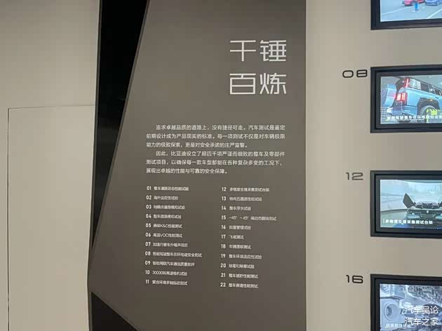 一辆车在制造过程中,还要经过无数次的测试,下图重点介绍有22项测试,与之对应的有图片和视频展示。