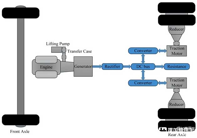 为了解决超重型矿用自卸车的驱动问题,工程师们引入了电驱动系统,由大排量的重型发动机充当发电机,为电机提供电能,最后由电机驱动车辆运行,从而规避变速箱带来的扭矩限制。同时,电机还能够在车辆下坡时起到辅助制动的效果,进而增强行车安全性。