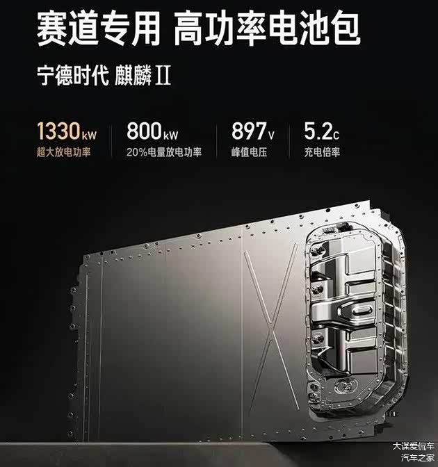 电池方面,小米 SU7 Ultra 全球首发宁德时代麒麟 Ⅱ 电池,拥有 1330kW 的超大放电功率和 16C 的最大放电倍率,以满足电机需求。SoC 在 20% 时,放电功率仍有 800kW,峰值电压 897V,充电倍率达到了 5.2C,达到 16C。